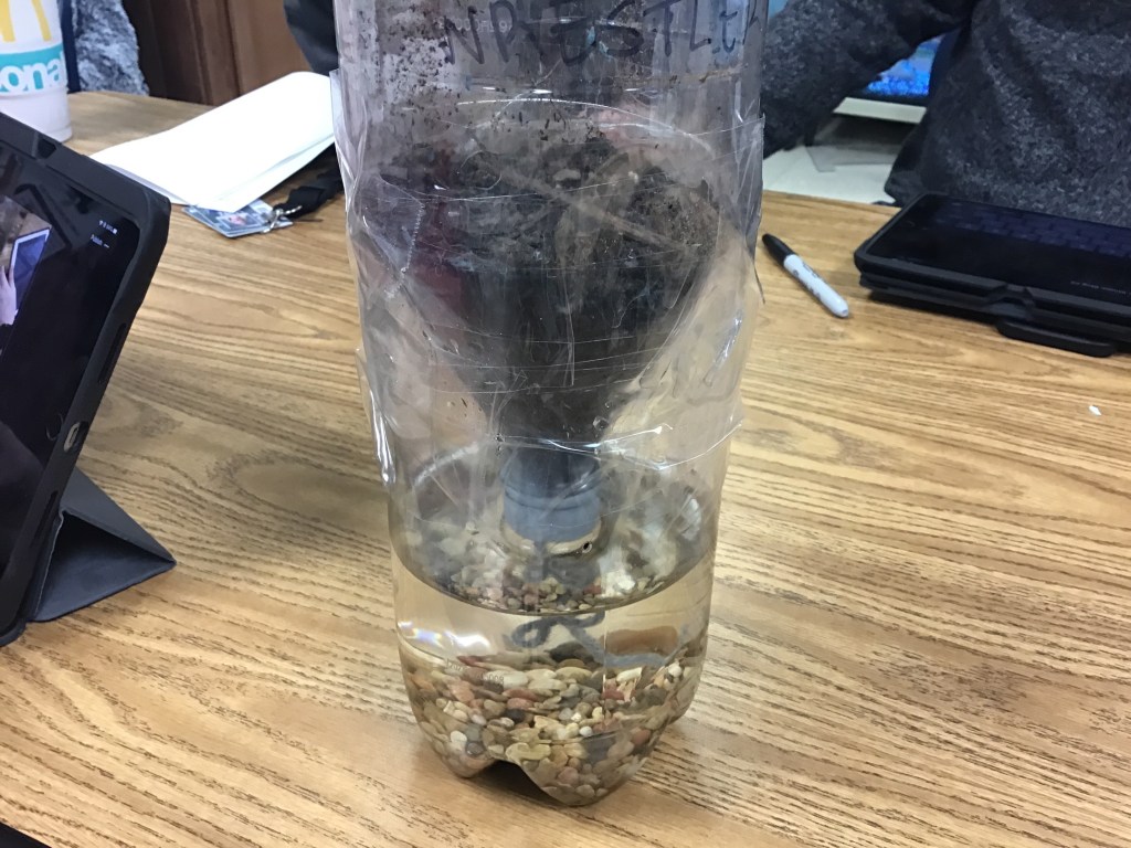 Step 6 : after you tape it together, take some dirt and pour it into the bottle should be around 2 1/2 inches of dirt.